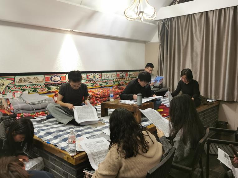 11月30日晚,结束了一天的行程后,在老师们的带领下,同学们共同展开了一场别开生面的交流研讨会。回顾一天的实地考察,结合之前的自主研读,大家围坐在窑洞的土炕边,共同翻看《新华日报》(华北版),从不同角度分享了对《新华日报》(华北版)的阅读体会和心得,宋声泉老师针对同学们的发言逐一进行点评、补充。康凤副书记鼓励同学们牢记红色历史,继续推动红色文学的研究与发展。颜梅书记表示,通过这样的“沉浸式”学习,让红色文化真正活了起来,希望同学们以此为契机,用好红色资源,赓续红色文脉,在新时代红色文学的理论建构与文化传播上有所建树。通过这场围炉座谈,同学们对红色文艺的重要性有了更切身的体会。王津同学说:“太行地貌和景观让我仿佛置身历史情境,跟随革命战士们坚实地踏在这片土地上,同时使我对当时文学的紧要任务和特殊形态有了更加深入的认识。”