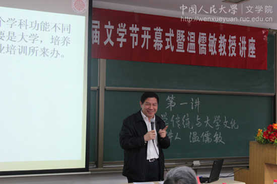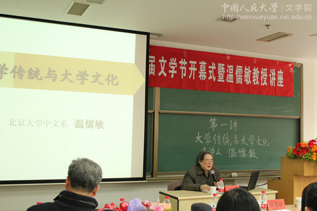 随后,温儒敏教授给同学们带来了精彩的讲座。温教授从教育问题入手,通过对比人大、北大、清华校训,深入浅出地讲解了中国的大学传统与大学文化。在细致独到地评点了三所高校的校训和校园文化后,他还一分为二地分析了中国著名高校的发展现状,语重心长地提醒当今大学生不要过分“趋时”而放弃精神追求。在肯定中国近几十年来大学教育的发展和成就的同时,温教授指出当今大学的三大弊端——市场化、平面化、官场化,并鼓励同学们成为有格调、有气度、有独立性的新一代青年。温教授风趣而犀利的演讲不时引起同学们的阵阵掌声。