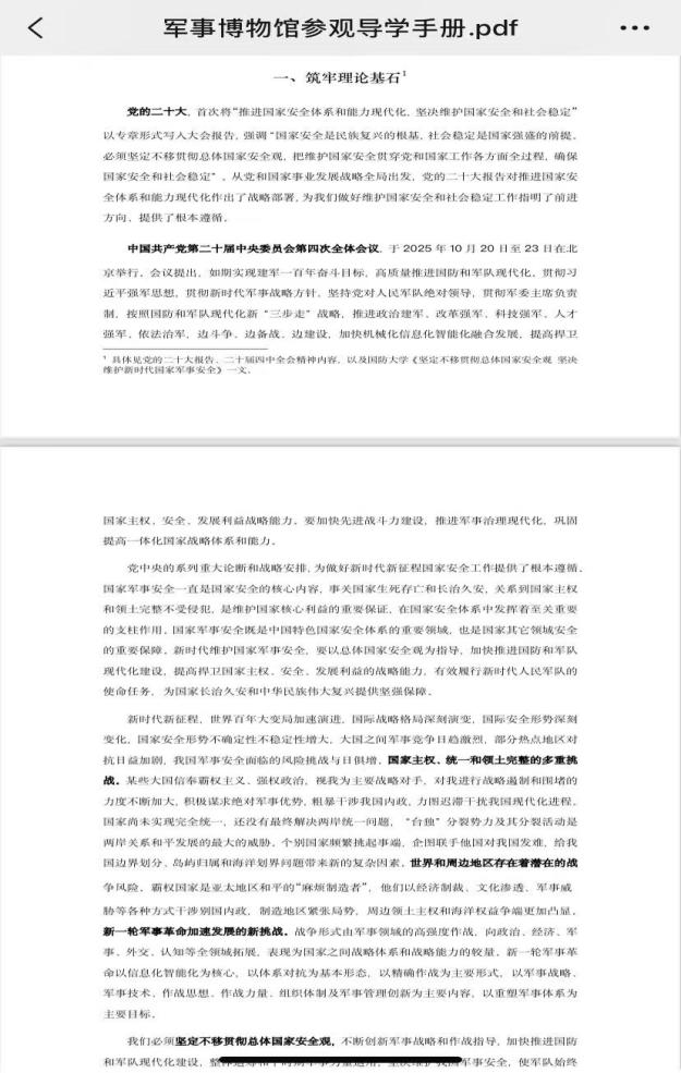 为确保研学活动“有目标、有深度、有收获”,党团支委陈曾媛同志、赵芮同志在活动前精心策划筹备,除了提前前往军博踩点游览路线外,还重点制作并发放了《军事博物馆参观学习导览册》电子版,为本次研学筑牢“理论基石”。导览册以“理清展陈逻辑、聚焦核心展品、关联精神内涵”为核心目标,系统梳理了中国人民革命军事博物馆“近代战争—抗日战争—解放战争—国防现代化建设”的展陈脉络,帮助同学们提前把握人民军队从萌芽、成长到壮大的关键历史节点,尤其明确了“深入理解抗日战争时期民族抗争的艰辛历程”与“重点感知新时代国防科技突破成果”两大学习重点。通过这份导览册,同学们提前建立起“文物—历史事件—民族精神”的关联性认知,为实地参观做好充分准备。