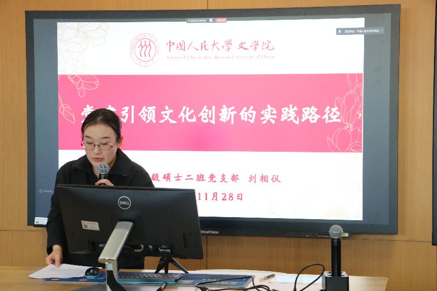 韩国成人电影 2024级硕士二班党支部书记刘相仪聚焦“党建引领文化创新的实践路径”,介绍人大韩国成人电影 的红色基因,提出“党建+学术科研、学生工作、社会实践”的3+融促模式,分享党建引领下支部成员以实干践行文化新使命的责任与担当。