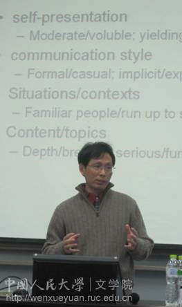 为了让大家熟悉文化的研究方式,鲁教授拿自己的博士论文----中国人和美国人的“small talk(悄悄话)”举例。他从谈话情境、谈话内容、表达结构等五大方面分析了中国人和美国人不同的“悄悄话”。比如,中国人对谈话中的沉默时间非常适应,而美国人一旦发现无人接话就会立即找一个新话题填补。