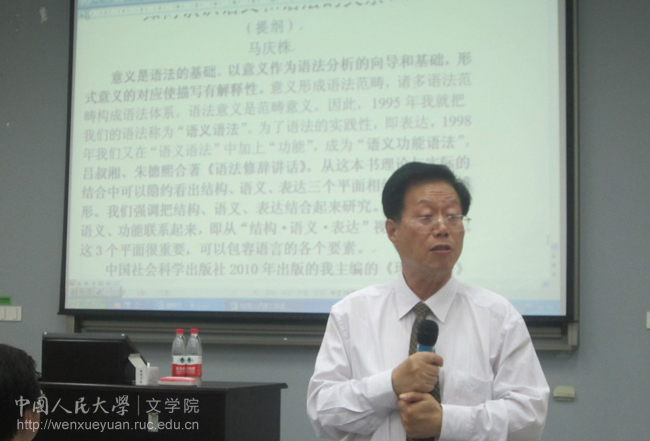 讲座正式开始后,马教授开宗明义,提出虽然语义和语法的关系不同的学者有不同的观点,有的重视意义,有的不重视意义,但中国语言学的研究传统是重视意义的,我们把意义作为语法分析的向导和基础,形式意义的对应使描写有解释性。我们的任务就是重视这种对应,找到这种对应,这是我们语法研究的重要目标之一。