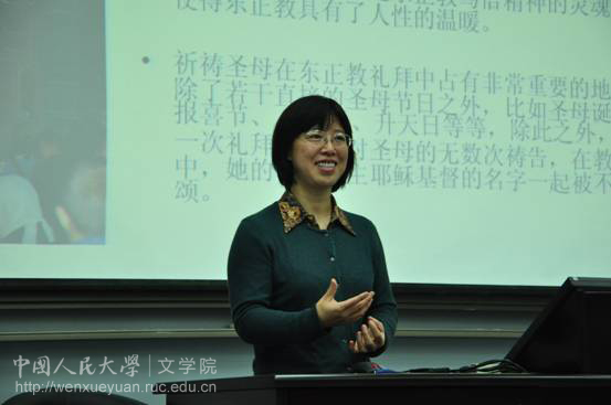 接下来,梁教授简单的介绍了一下东正教。之后,梁教授详细地讲解了受东正教影响而形成的俄罗斯六大民族精神:聚和性、万物统一学说、索菲亚学说·圣母崇拜、耶稣崇拜、复活节意识、民族弥赛亚意识、圣像崇拜以及这些民族精神在俄国文学中的体现,并对东正教与天主教做了对比,以及对于俄罗斯绘制圣像的思想三原则和技巧理论的理解。最后梁教授为同学们解释了东正教中十字架的不同形式及其深刻内涵。